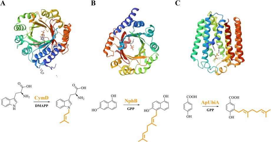 图2 三类具有代表性的异戊烯基转移酶(PTs)晶体结构与所催化的反应。CymD属于DMATS型PTs,NphB属于ABBA型PTs,ApUbiA属于UbiA型PTs