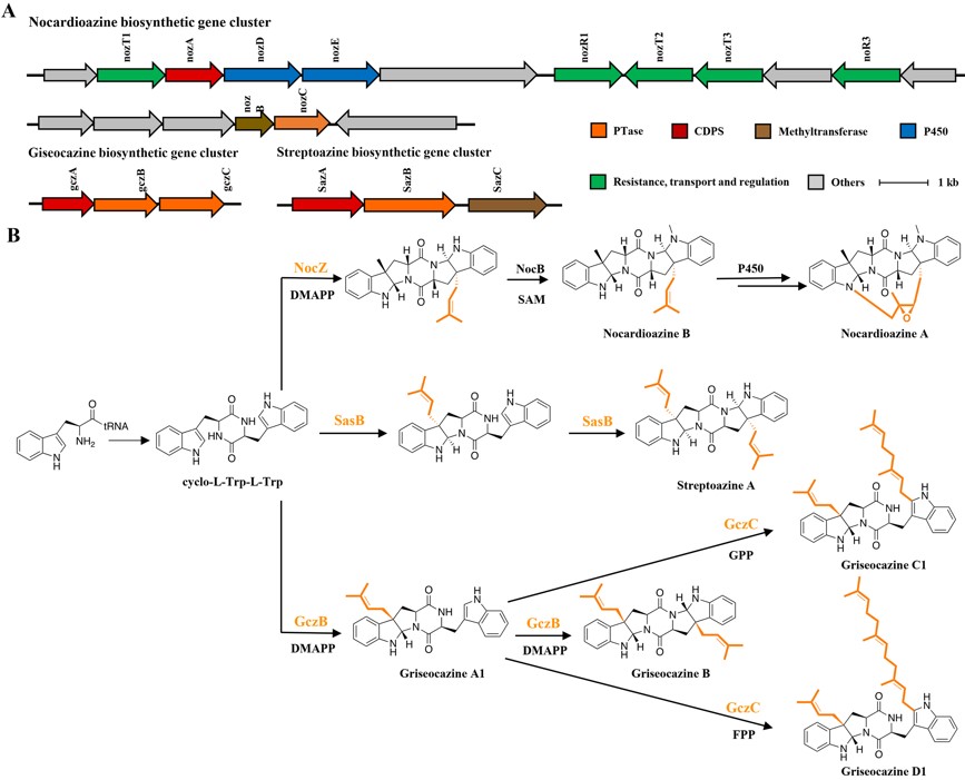 图4 三类代表性异戊烯基化二酮哌嗪衍生物合成基因簇(A)与生物合成途径(B)