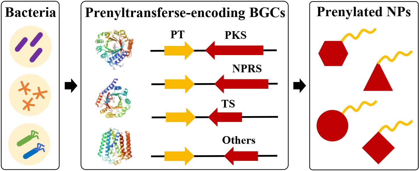 图1 细菌来源的异戊烯基化天然产物生物合成模式图