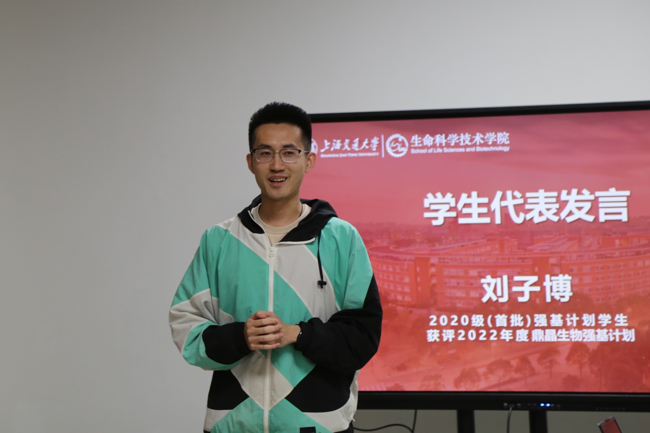 2022年度获奖学生代表、2020 届强基计划的刘子博作为首届获奖学生代表发言。刘子博对罗鹏学长表达了由衷的感谢,罗鹏学长不仅是学生职业规划道路上的榜样,还为学生提供了获取产业经验的平台,他表示自己在博士阶段将继续笃学致远,书写属于自己的精彩篇章。