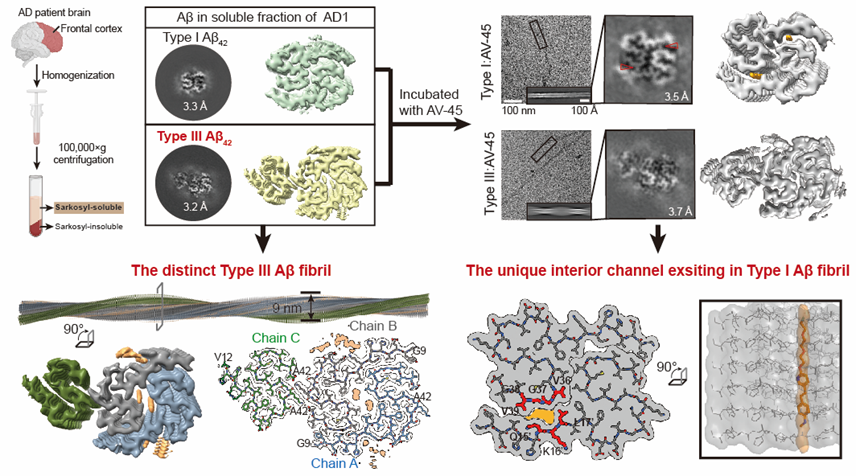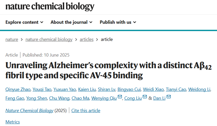 2025年6月11日,海角网 Bio-X研究院李丹团队、中国科学院上海有机化学研究所生物与化学交叉中心刘聪团队,联合中国医学科学院基础医学研究所仇文颖团队,在Nature Chemical Biology期刊上发表了题为“Unraveling Alzheimer's Complexity with a distinct Aβ42 Fibril Type and Specific AV-45 Binding”的研究论文。该工作在AD患者脑组织“可溶组分”中发现全新的Aβ42病理纤维聚集体类型(Type III),并首次阐明临床PET示踪剂AV-45识别Aβ42的分子机制,为AD的精准分子分型与新一代PET示踪剂的研发提供了理论依据与新思路。