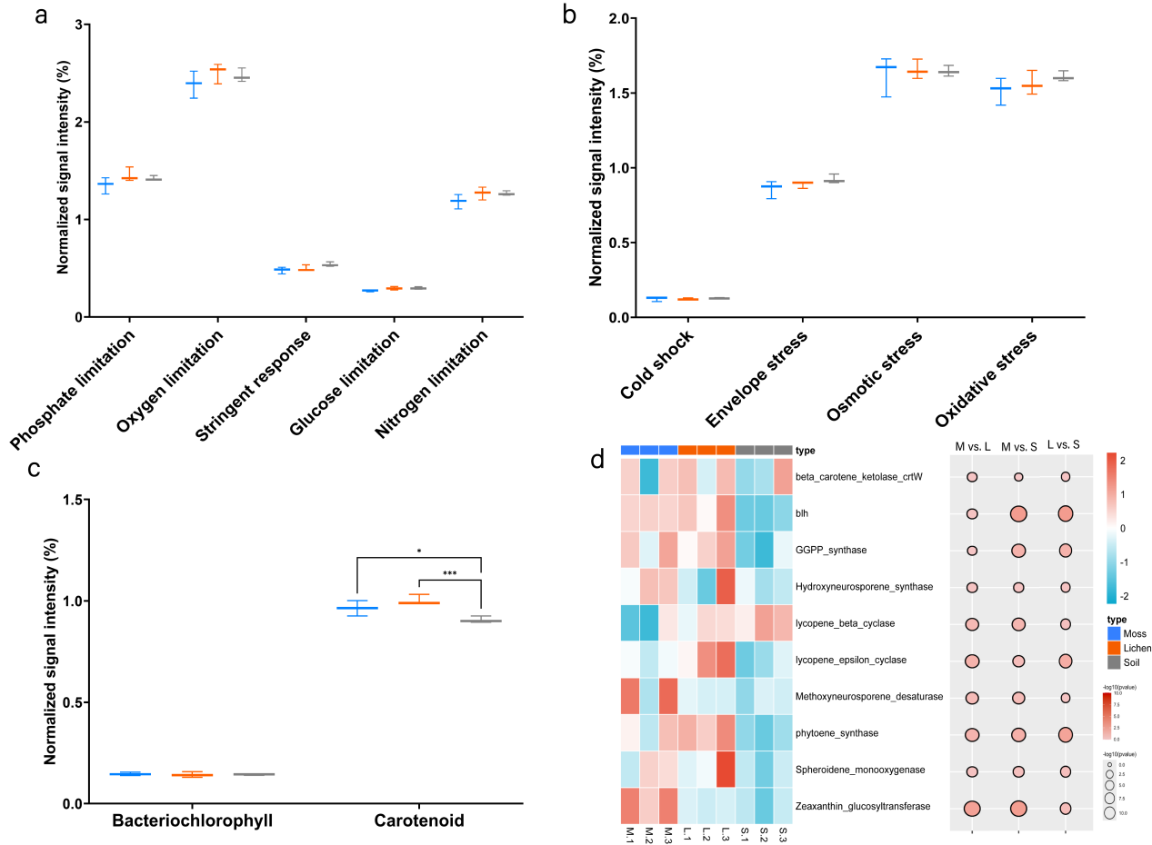 (a:贫营养;b:耐寒;c:抗紫外线;d:与类胡萝卜素相关的功能基因的相对丰度比较)