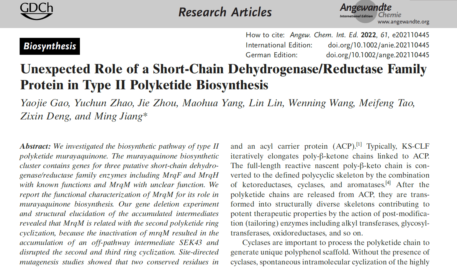 Unexpected Role of a short-chain dehydrogenase/reductase family protein in type II polyketide biosynthesis. Gao Y, Zhao Y, Zhou J, Yang M, Lin L, Wang W, Tao M, Deng Z, Jiang M, Angew Chem Int Ed Engl. 2022, 61(7): e202110445.