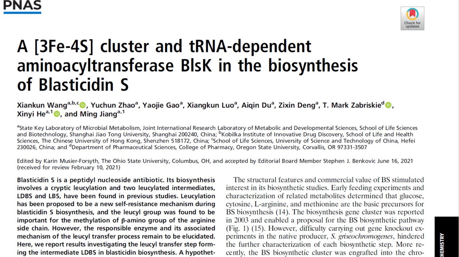 A [3Fe-4S] cluster and tRNA-dependent aminoacyltransferase BlsK in the biosynthesis of Blasticidin S. Wang X, Zhao Y, Gao Y, Luo X, Du A, Deng Z, Zabriskie TM, He X, Jiang M. Proc Natl Acad Sci U S A. 2021, 118(30): e2102318118.